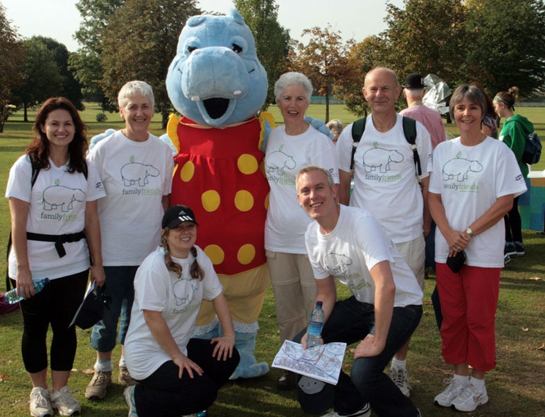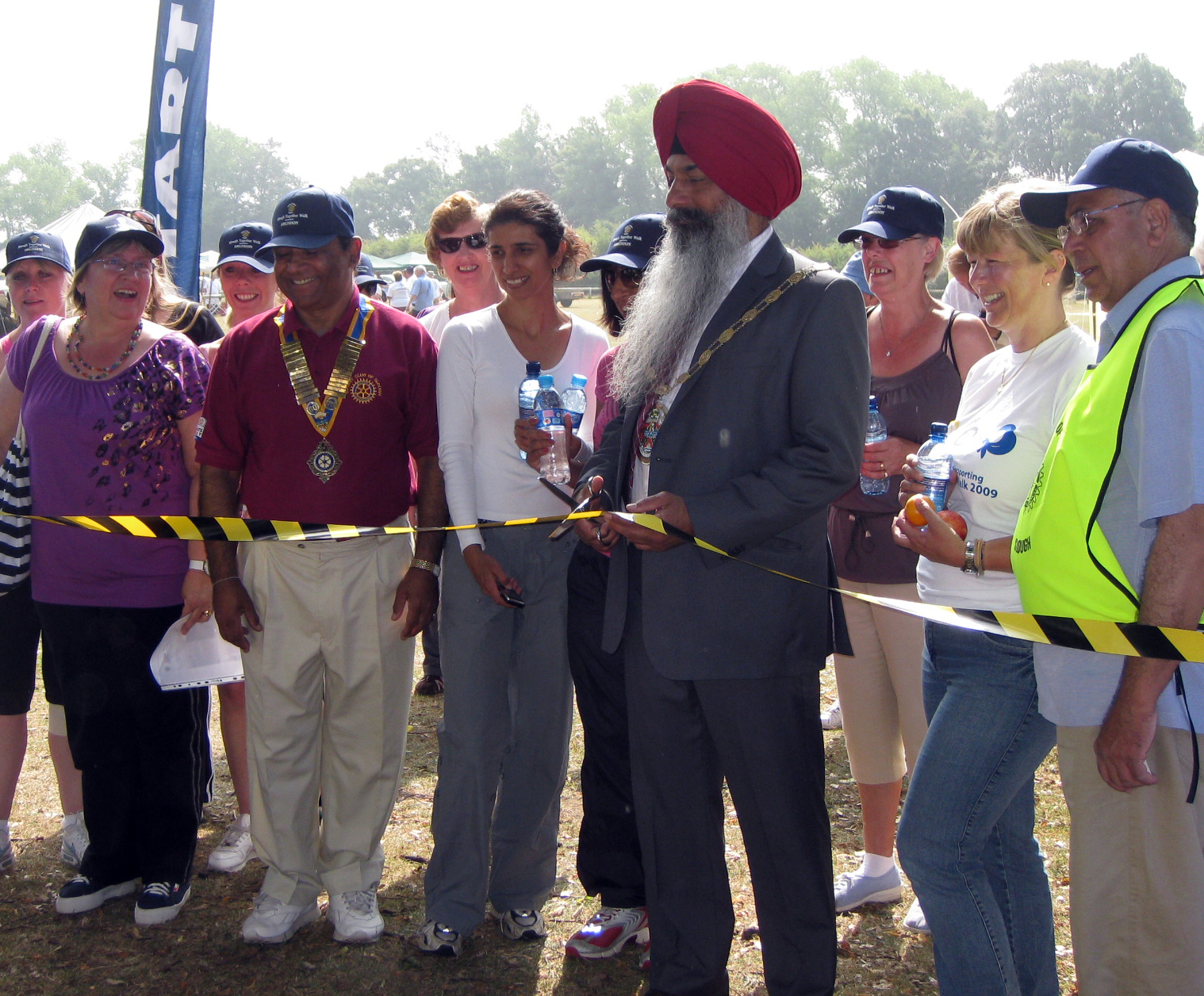 Above: r, the Mayor of Slough cuts the starting ribbon for the 2009 walk, l, members of the Family Friends charity team after finishing in 2011